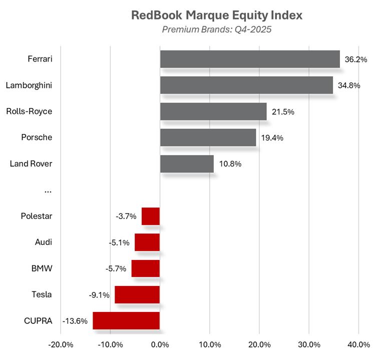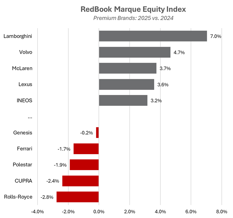 Over the past year, Rolls-Royce, CUPRA, Polestar, Ferrari, and Genesis recorded modest declines, while INEOS, Lexus, McLaren, Volvo, and Lamborghini achieved gains, highlighting the need for strategic brand management and distinctive offerings.