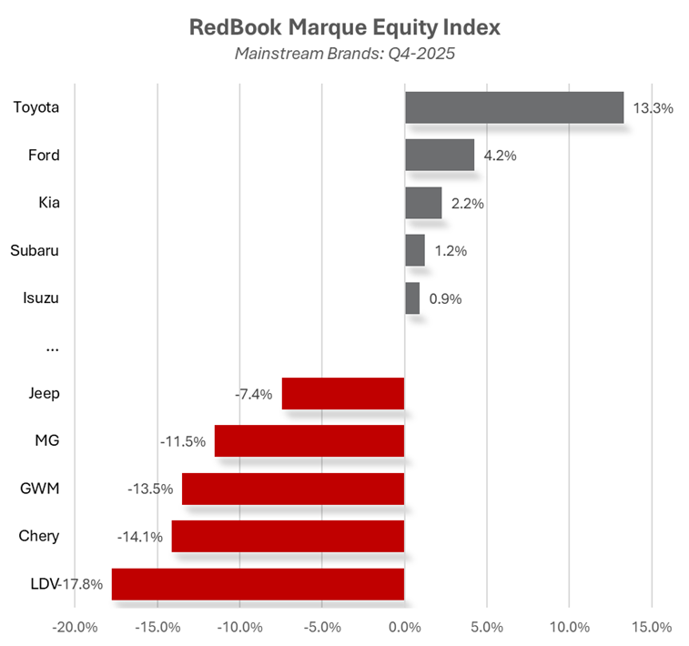 The mainstream market is shaped by both emerging and established players. LDV, Chery, GWM, MG, and Jeep occupy the bottom five positions, with LDV at -17.8%, reflecting ongoing challenges in price retention. These brands face headwinds from market perception, supply chain volatility, and competition.
