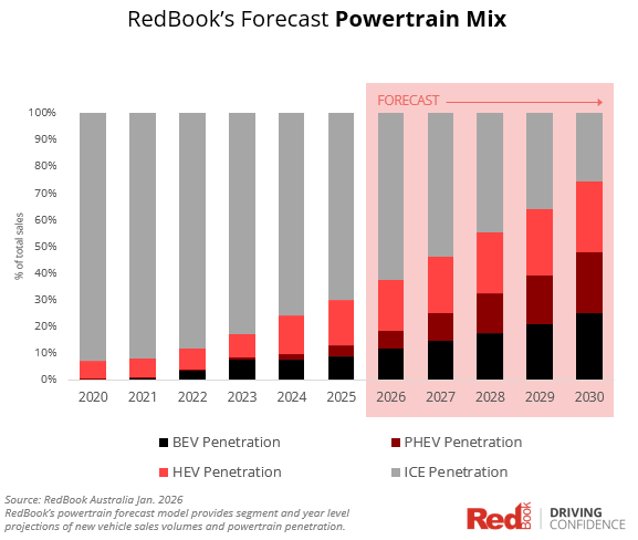 With pump prices in capital cities pushing $2.50/L amid Middle East supply uncertainty, Australia has been handed a real-world stress test for the economics of powertrain choice. It’s also a timely checkpoint for the RedBook 2030 Powertrain Forecast, a model built before the latest supply-side shocks, and one that already anticipates a steady transition to New Energy Vehicles (NEVs), with an exponential inflection post-2030.